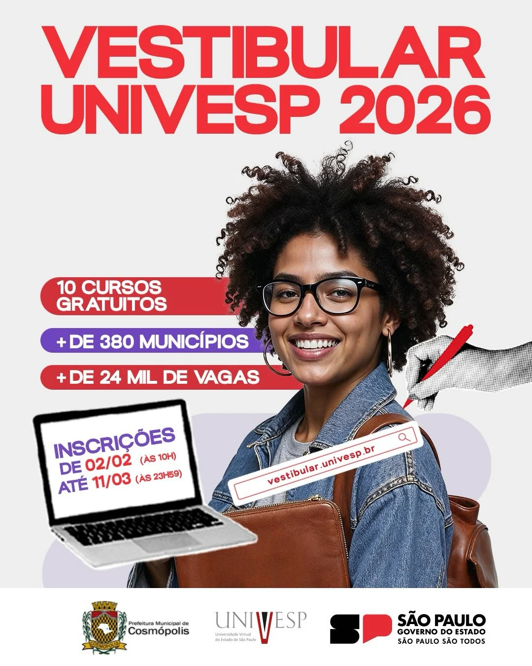 A Universidade Virtual do Estado de São Paulo (Univesp) abriu na segunda-feira (02/02), as inscrições para o Vestibular 2026, com 24.029 vagas gratuitas em 10 cursos, distribuídas em polos de centenas de municípios.